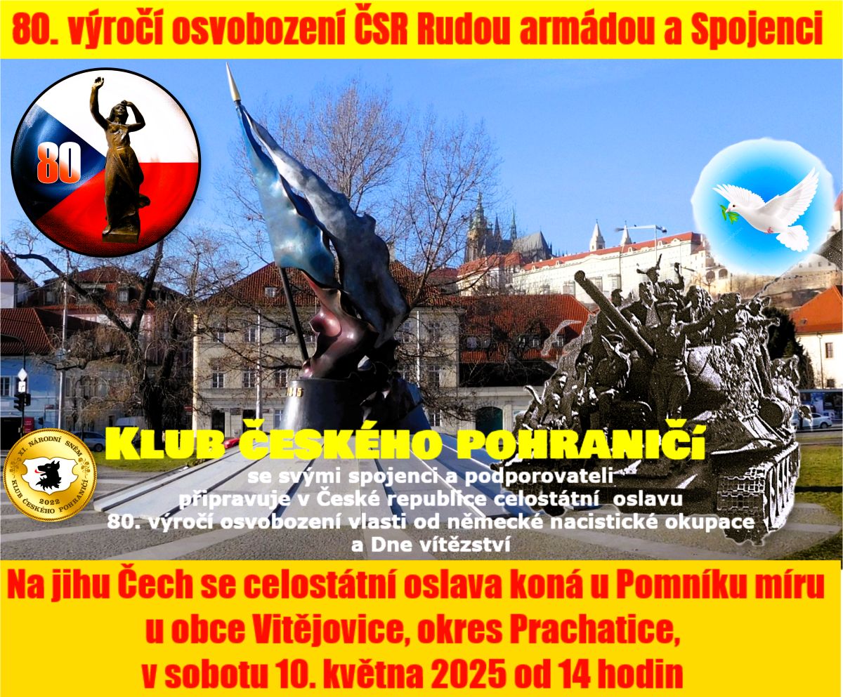 Přijďte oslavit 80. výročí osvobození ČSR Rudou armádou a spojenci v roce 1945. Oslava proběhne u Pomníku míru ve Vitějovicích, s programem zahrnujícím nástup vlajkonošů, položení věnců, hymny osvoboditelů, projevy a uctění památky obětí války.