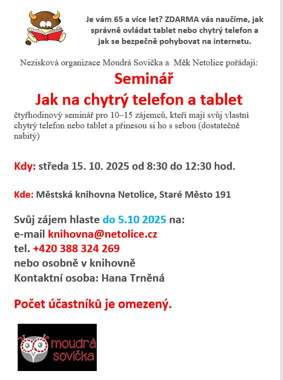 Seminář moudrá sovička pro 65+ s vlastním chytrým telefonem nebo tabletem proběhne 15.10.2025 od 8:30 do 12:30 hodin.