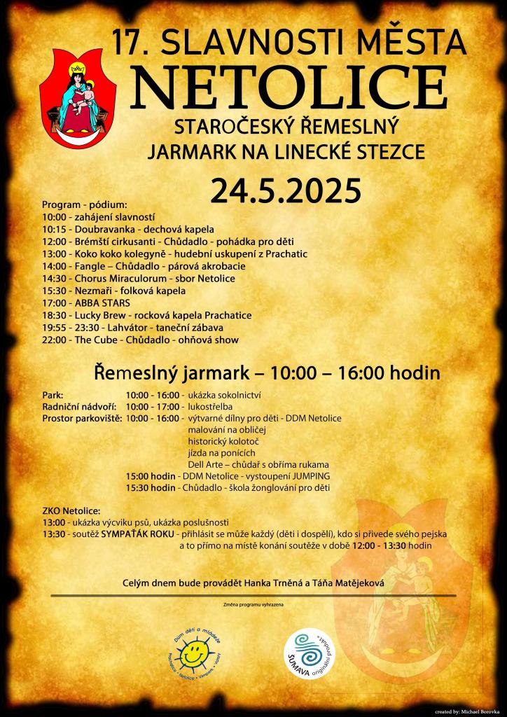 Slavnosti města Netolice se staročeským řemeslným jarmarkem na Linecké stezce. Uzavřeno bude celé náměstí, ulice Obecní od obchodního domu k náměstí a ulice Mnichská od náměstí k ulici Hořejší Mlýnské od 23.5.2025 od 18:00 hodin do 25.05.2025 do 14:00 hodin.Náhradní autobusová zastávka Petrův Dvůr.