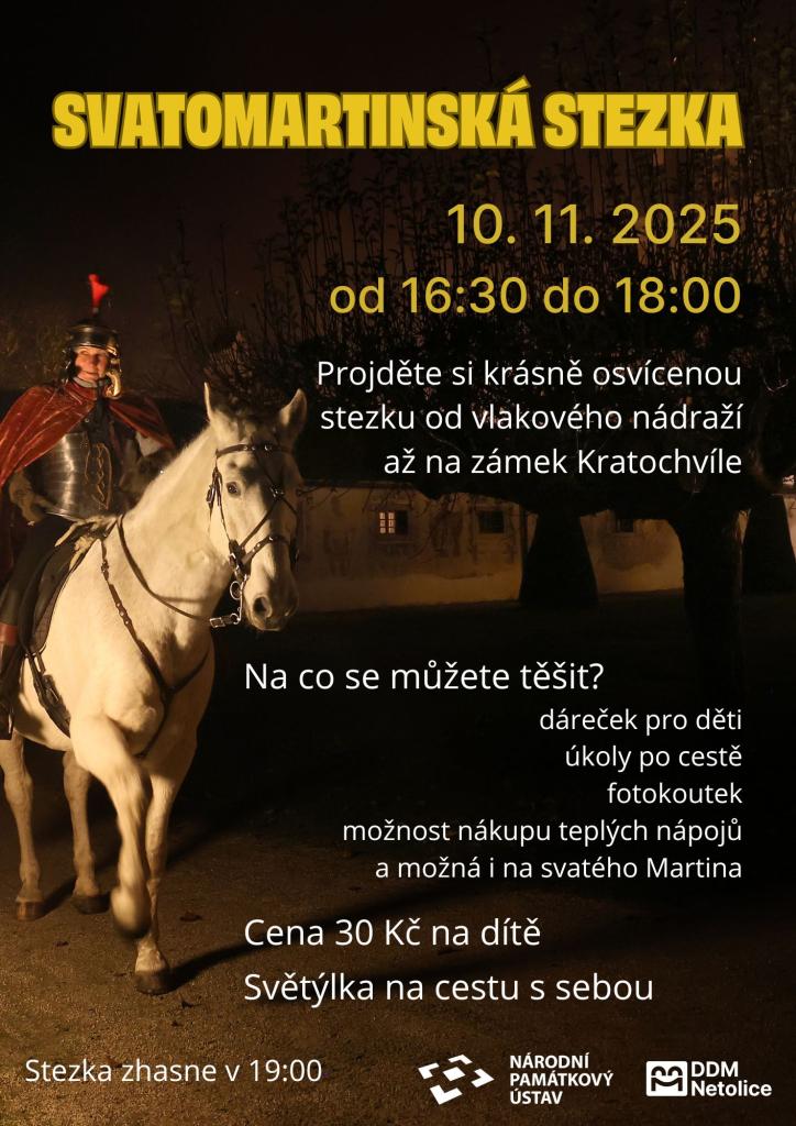 Cesta plná světýlek a úkolů pro děti. Přijďte si užít příjemný podvečer s vašimi dětmi a na závěr si koupit teplý nápoj. Začátek stezky je na vlakovém nádraží v Netolicích a vede až k zámku Kratochvíle.
